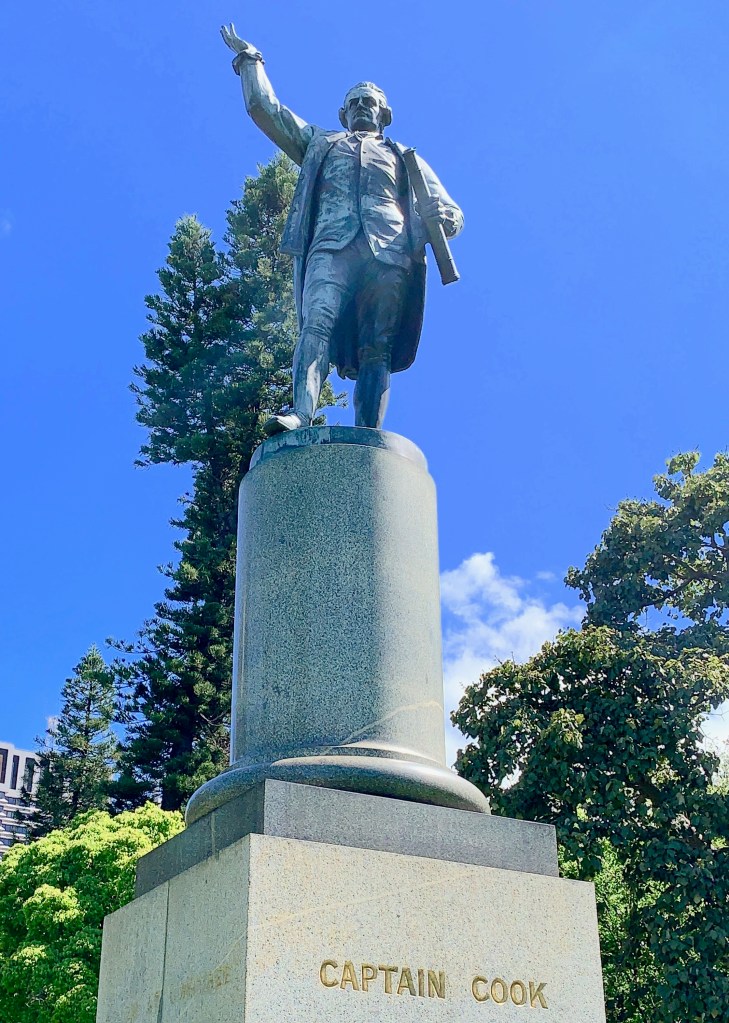 my first destination is the sydney tower, an observation deck that juts out from the downtown skyline. but when i get to the admission window, which is in the middle of an obscenely opulent shopping mall, i learn that the price for a ticket to go out on the observation deck is $82. no thanks. instead i walk another block to hyde park, where an iconic statue of captain cook still stands, 250 years after his historic arrival in sydney harbor, although there have been calls for its removal.