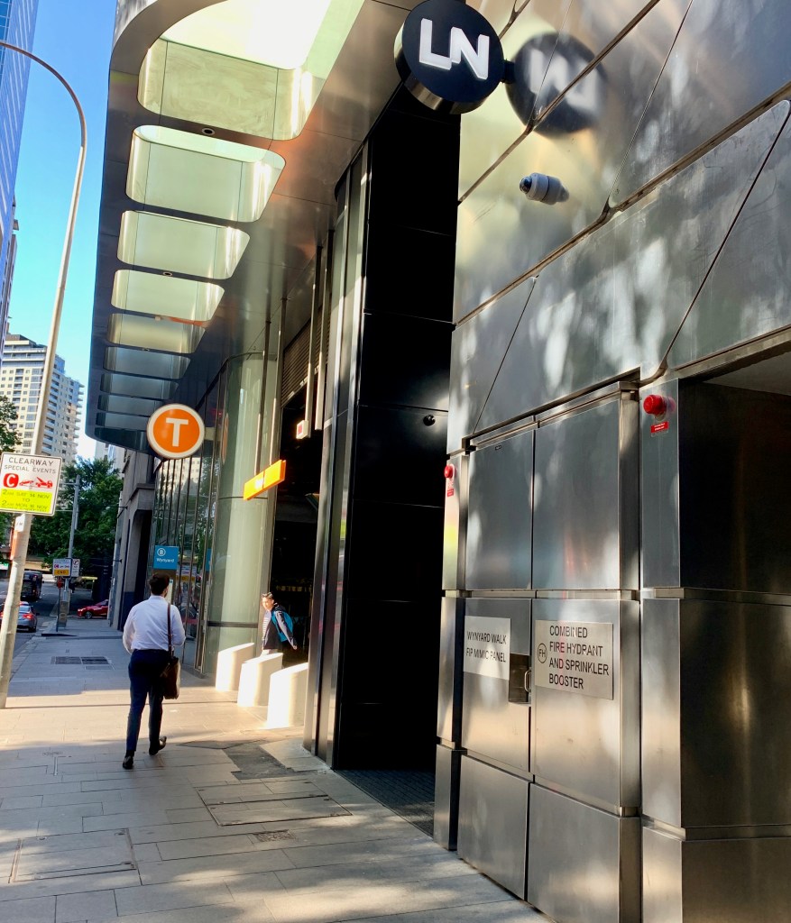 however, as can happen when you try to save a buck, when we got there the hotel was…gone! we drove up to the address, 26 clarence st. and found 36, and 16, but no 26. it was sunday evening and the street was quiet, but the spot where 26 should have been seemed to have been taken over by the wynyard metro station.