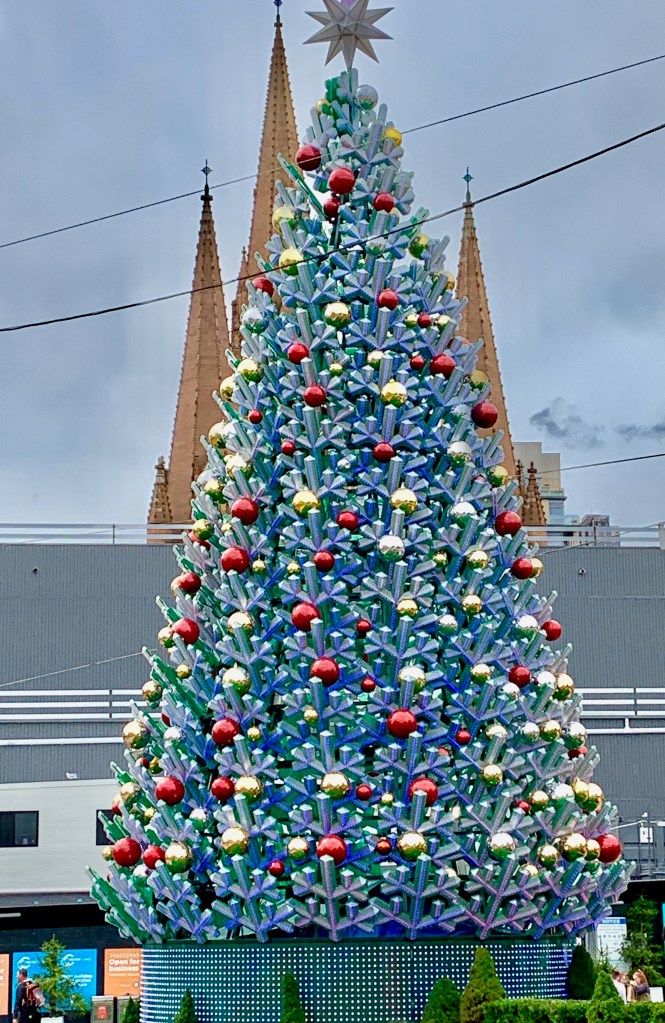 ok, not that young!! a few blocks further on, at federation square, a family of immigrants from nepal is taking pictures in front of the christmas (chrissy to aussies) display to send to relatives in kathmandu. nepal is a hindu country, though interestingly, the communist party currently holds power there. the silver and blue belled tree accented by steeples from the nearby st. paul’s cathedral makes a nice backdrop no matter where you’re from.