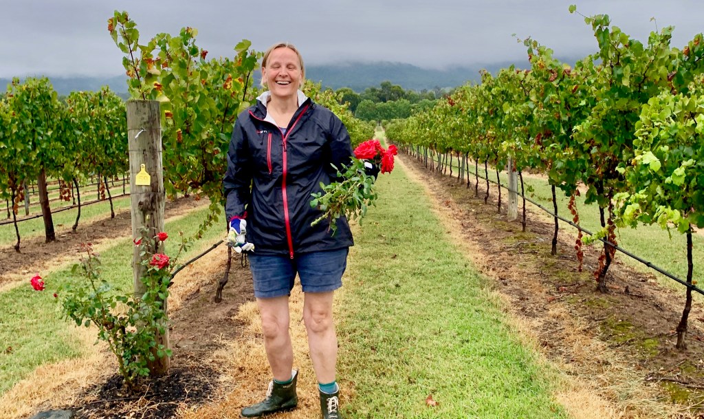 sunshine was in short supply the day of the gallery opening. as dawn broke over broke, a gloomy mist shrouded the valley, and a drizzly downpour was forecast. nevertheless, we found karin out in the vineyard at first light, harvesting roses to brighten the mood.
