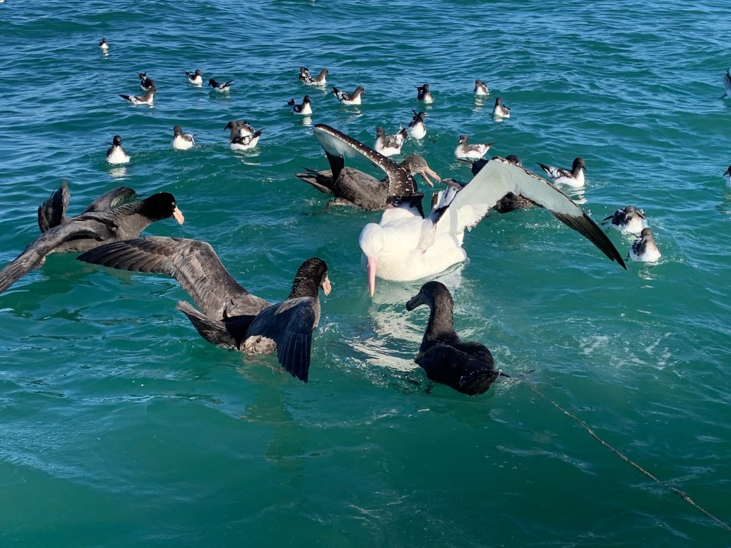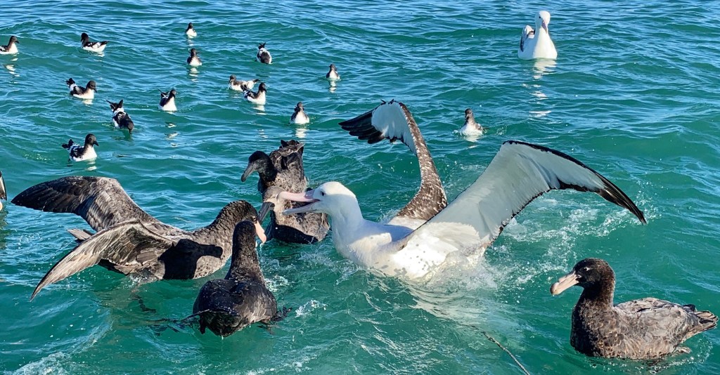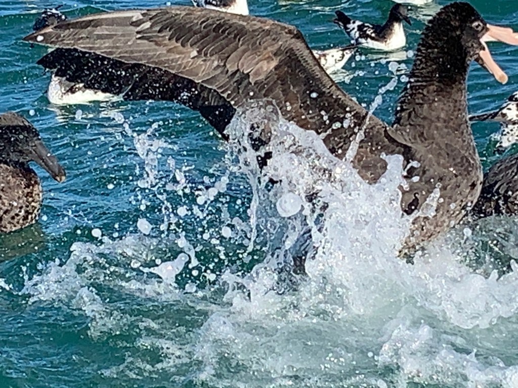 the flock was waiting for us. five different species of albatross and all kinds of petrels made it a diverse group. (though lacking in equity or inclusion). unlike the human world, the laws of nature are unchallenged in the bird kingdom. survival of the fittest rules. as the albatross swoops in with a whoosh, smaller birds scoot out of the way.