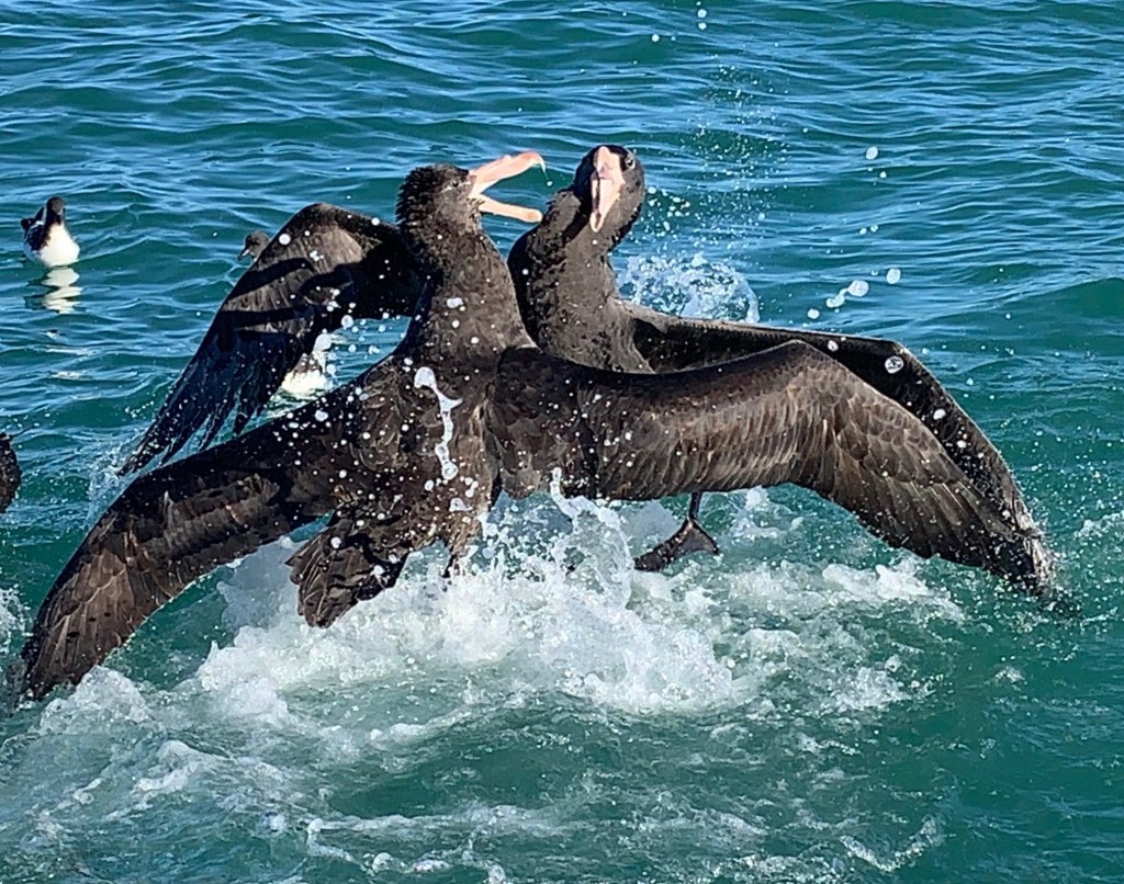 the skipper has brought along a net filled with fish scraps, and as he drops the scrap net in the water, a scrap begins. the scrappiest are the albatrosses, first in the pecking order. next are the black petrels, who scrap playfully among themselves while waiting for leftover scraps. smaller species hang around until the big fellows are done, then scrap among themselves for the scraps of the scraps. we have a front row seat.