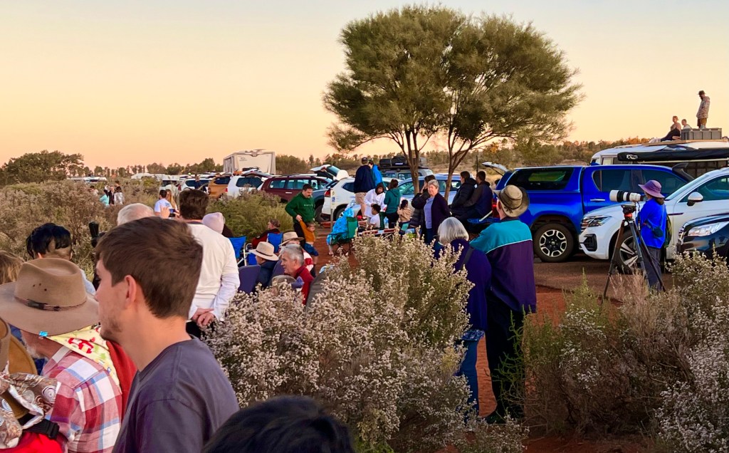 now the experience. the restaurant is outdoors in the desert on a hill strategically situated for viewing the sunset over uluru. we assemble at a nearby hotel an hour before sundown for the 30-minute bus ride to the dining area under the stars.