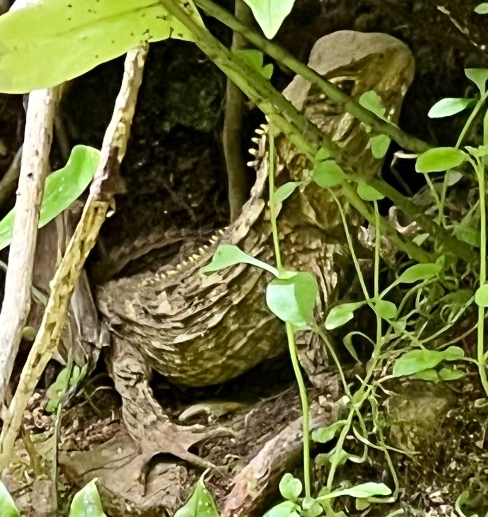 so…what’s to see in the bird sanctuary? lizards! tuataras to be precise. (ok, it’s mostly about birds, but…) these non-threatening reptiles hide there, living mostly on insects and other microscopic characters too small to be of concern. they’re darned hard to see. it took me nearly five minutes of looking at this bit of underbrush to make out the tuatara hiding in the photo.